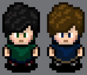 To the right, this picture shows two sprites modeled after Andrew, and just shows how slight variations in the character’s coloring can make characters feel different. The two sprites have the same body and hair, but just the changes in the coloring seem to give them two different moods. I really look forward to seeing the different combinations that players come up with when they make a character. Even just subtle differences seem to make a character more personal, which is important to me when I invest time in a game. Even though other people are playing the game, having your own character makes it feel a little more special.
